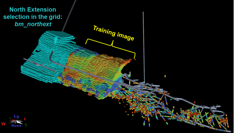 Imerys avait déjà collaboré avec Geovariances pour des formations en géostatistique, au cours desquelles plusieurs méthodes de simulation avaient été présentées, dont la méthode des statistiques multi-points (MPS). Cette technique a suscité l’intérêt de l’équipe pour son potentiel à exploiter la connaissance acquise sur la zone Nord comme image d’apprentissage.