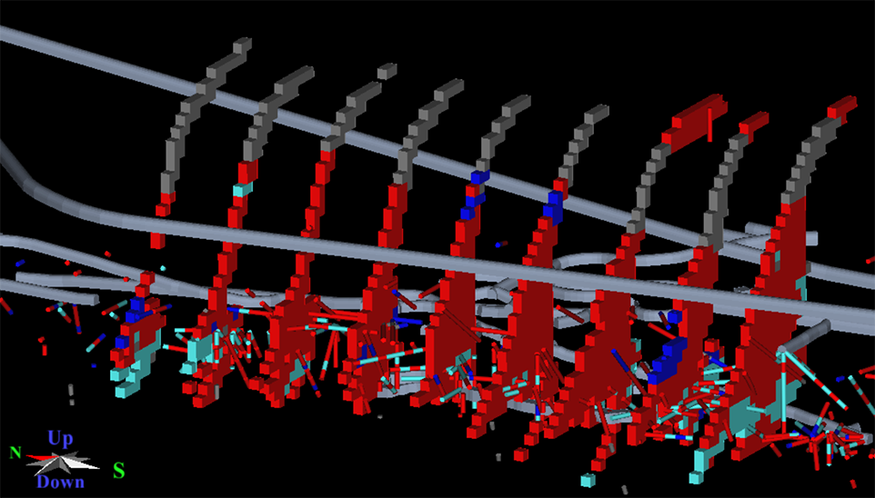 3| L’équipe a alors ajusté l’objectif : plutôt que d’estimer un pourcentage, elle a cherché à attribuer une lithologie par bloc (talc, carbonates, micaschistes). Cette fois-ci, les simulations plurigaussiennes (PGS) se sont révélées plus adaptées. Isatis.neo a facilité l’analyse statistique, la visualisation spatiale, la transformation des données en lois gaussiennes, et l’exécution des simulations..
